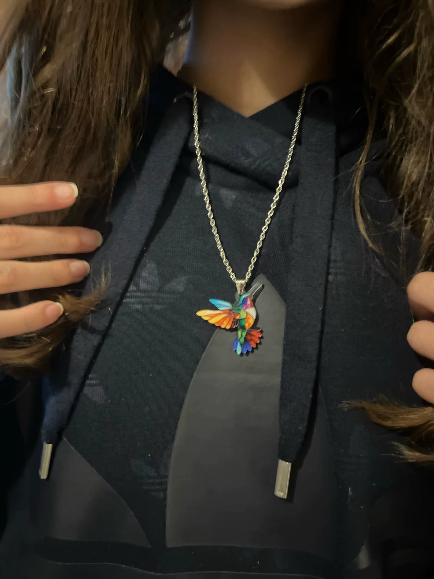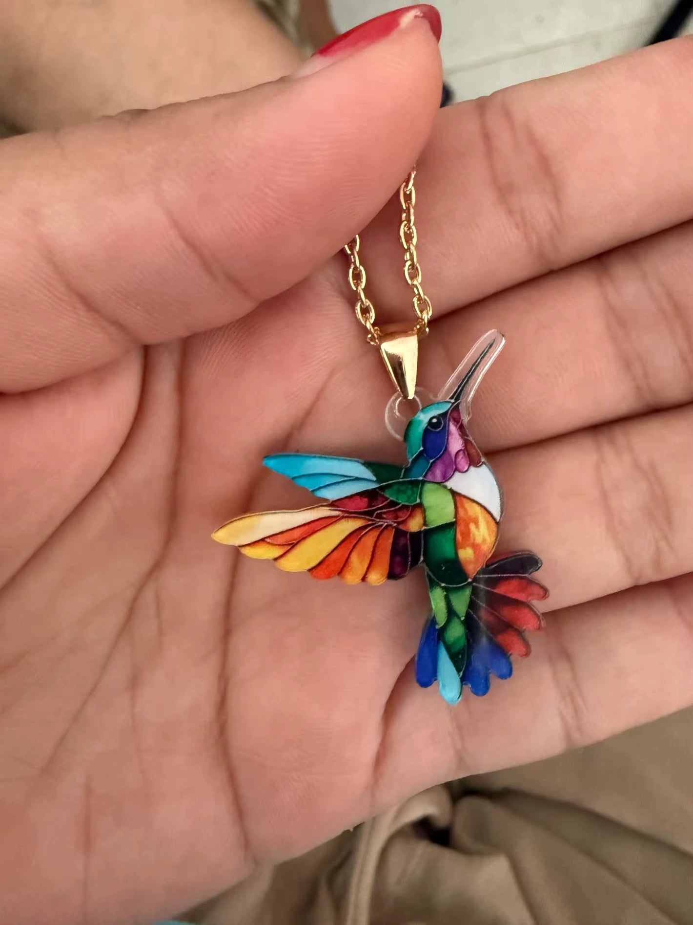 Ilumina tu outfit y recuerda lo bonito del presente con este colibrí multicolor de acabado tipo vitral, lindo, llamativo y súper combinable.